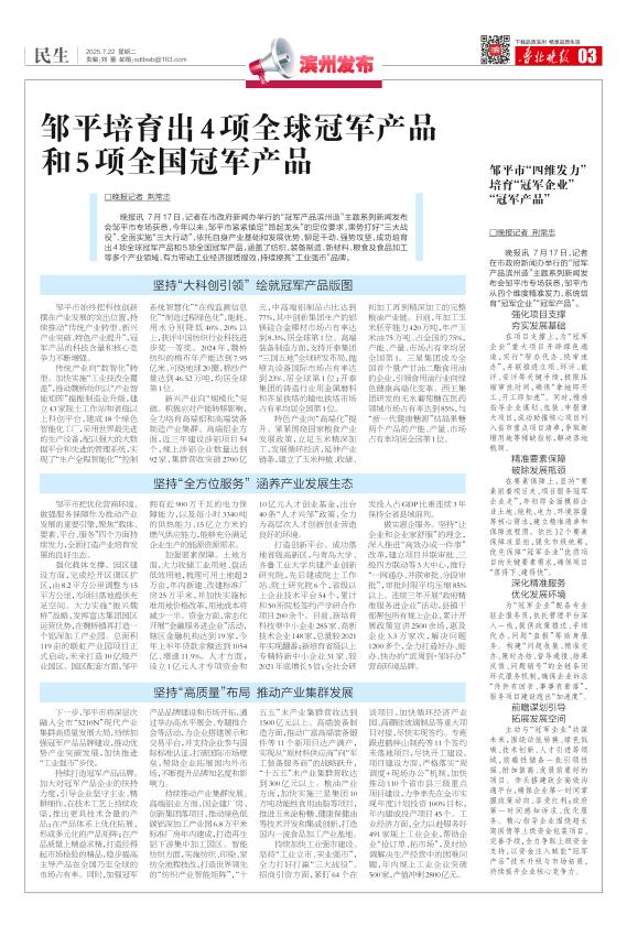 邹平培育出4项全球冠军产品和5项全国冠军产品