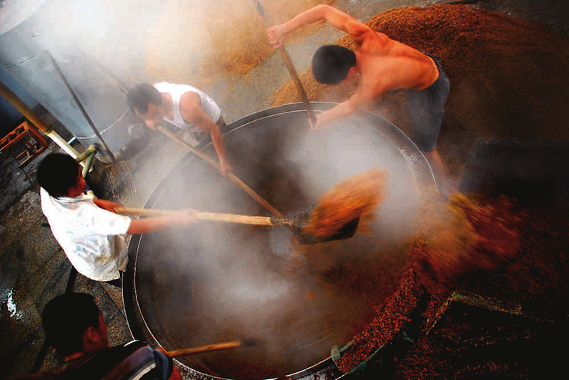 伴着第一缕晨光骑车上班的还有个老头儿,叫董付新,同样是古贝春集团的技术权威。他和吴兆征不分伯仲,二人年龄相仿,技术相当,一个是总工程师,一个是总酿酒师,都是酒林高手。不同之处在于使用的“武器”,吴大师用瓶瓶罐罐和烧杯试管,来来回回地勾,千回百转地品,凭的是细如发丝的精准和高倍敏感的“嘴上功夫”;董大师舞得行云流水、步步生花的是一把木锨,靠的是匀匀实实如同箩面的装甑绝技、手抓目测粮糟温湿度以及发泥制曲、分级摘酒如探囊取物的“手上绝活”。还有,每天到厂里,吴兆征率先走进的是酒库,是试验室;董付新一头扎进的是曲房或窖池车间。