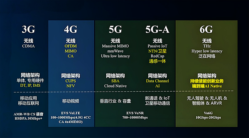 从上图可以看出,从3G到6G,移动通信技术每一代都有显著提升: