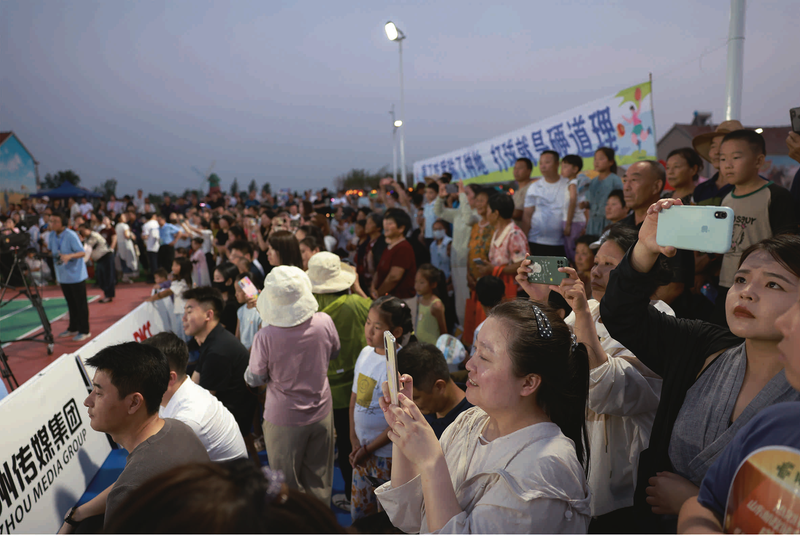 中场休息时,身着花布衣裳的演员走到球场中央,随着欢快的音乐翩翩起舞,她们手中的扇子如同蝴蝶翅膀不停摇摆,每个人的脸上露着幸福的微笑。