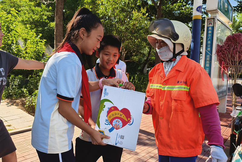 队员们来到新立河旁的街道上,为正在清扫的环卫工人递上冰镇酸梅汤;来到黄河五路繁忙的路口,给指挥交通的交警送上解暑的西瓜;来到消防队,为正在执勤的消防员叔叔送上矿泉水,并敬队礼致敬;来到阳光大厦的市政维修点,送上解暑的藿香正气水,并认真聆听劳动者的故事,深刻体会平凡岗位的伟大;孩子们也没有忘记天天坚守校园的门卫爷爷,送上亲手制作的饮品,并表达感恩之情。