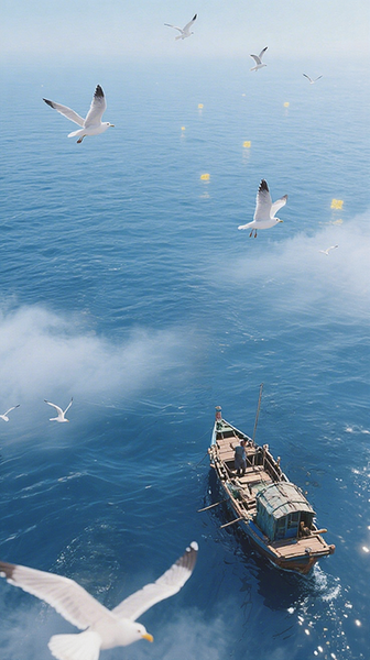 一束光照进水底,我被惊醒,不知为何被夹在了鱼鳞之中。忽然海鸥的长喙叼起了鱼儿,我猛地跳上海鸥的翅膀,紧紧抓住了它的羽毛。