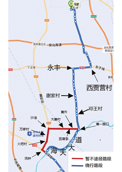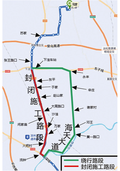 (绕行期间不再途经:火把村、万家村、沙洼村、大姜村、牛家村、豆腐李村、王升村、黄升村。建议候车的乘客朋友们到就近的站点候车:黄一村路口、海天大道。)(掌握滨州)