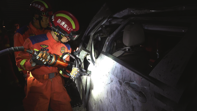 消防救援人员首先观察被困人员身体被卡情况,并询问是否有其它部位受伤。随即利用液压破拆工具组对驾驶室车门进行破拆,经过2分钟的紧张处置,消防救援人员将车门破拆完毕。医生检查完被困人员腿部后,消防救援人员将被困人员从车内慢慢扶出来,并抬上救护车送往医院救治。