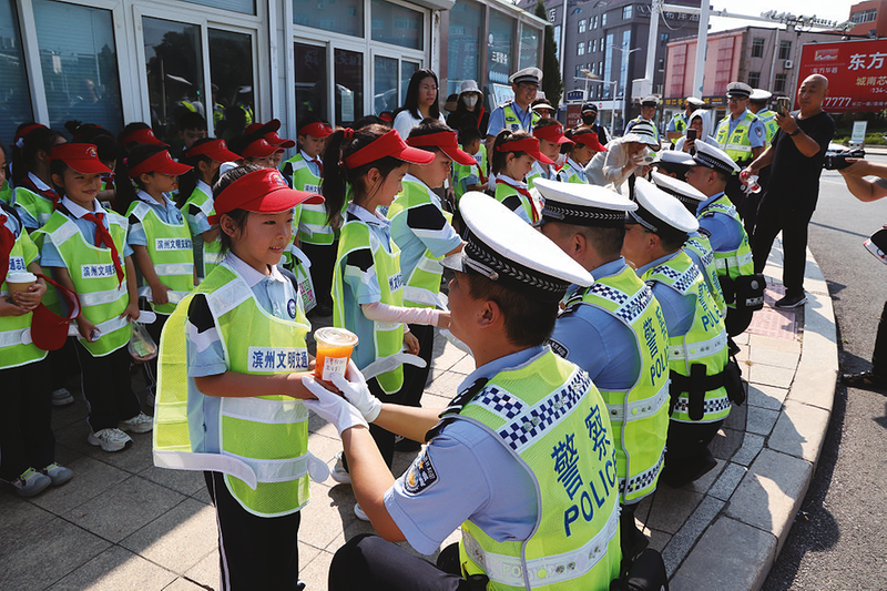 在滨城区黄河五路渤海十路路口,一群身着整齐校服的同学们化身文明交通志愿者,在交警的悉心带领下,认真学习交通指挥动作,一招一式有模有样。他们跟随交警,在路口对过往的电动车骑行人员进行耐心劝导。同学们用稚嫩却真诚的声音说道:“叔叔阿姨,为了您的安全,请佩戴好头盔。”不少市民被同学们的热情和真诚所打动,纷纷主动戴上头盔。之后,同学们将亲自熬制的酸梅汤、柠檬茶等饮品送到交警手中,一杯杯清凉的饮品,传递着同学们对交警的感激与敬意。