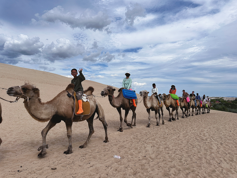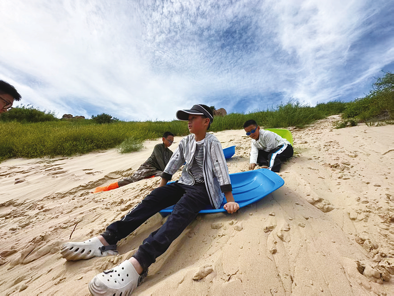 1971年,这里出土了红山文化的玉龙“中华第一龙”,玉龙沙湖由此而得名。美轮美奂的玉龙沙湖,拍照非常出片。孩子们乐此不疲地滑沙,还有好玩的沙漠摩托、沙漠越野,最难忘的是坐在骆驼背上,慢慢悠悠地走在沙漠里,感受那沙子的柔软和骆驼的稳健,真是一次奇妙的旅行体验!
