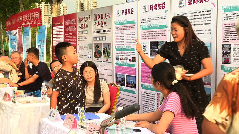 现场精心布置的二十余块宣传展板前,孩子们拉着家长的手,兴奋地指着“儿童友好社区里的游戏角”“学校门口的彩色过街天桥”等图文内容,分享着自己的生活体验。