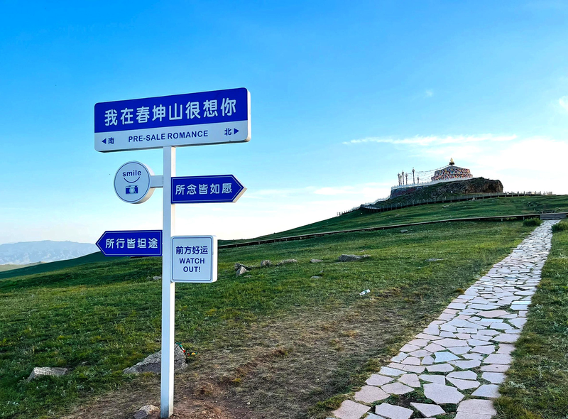 “我爱春坤山”的字牌非常醒目,这里算是一个打卡地,游客争相与之合影。如果说拍照的好去处,“天空之镜”绝对是不二选择。人站在蓝色的玻璃上面,会拍出重影,仿佛与天空融为一体,瞬间有了那种“他皆任厚地,尔独近高天”的美妙感觉。所谓天人合一,物我相融,莫不如此吧。