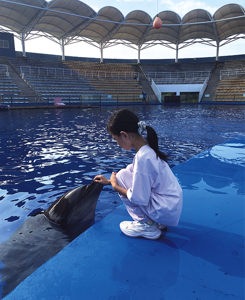 表演结束后,我有幸来到水池边跟海豚亲密接触。一只海豚游过来,它的嘴轻轻蹭了蹭我的指尖,带着海水的微凉,凑近了闻,是淡淡的海盐味。海豚好像在对我说:“你是我的朋友,可一定要保护好我们啊!”我对海豚说:“会的,我们一定会做到不乱扔塑料袋、塑料瓶,不乱倒垃圾,保护好你们的家园——海洋,保护好我们可爱的朋友——海豚。”