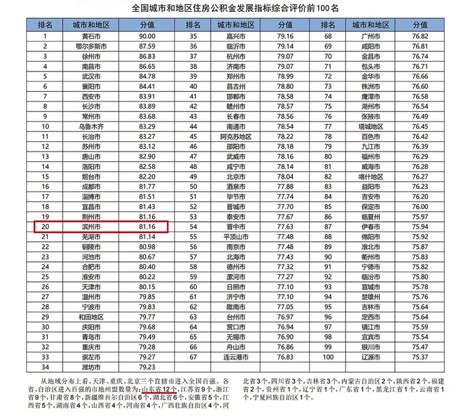 全国城市和地区住房公积金发展指标综合评价排名出炉滨州市榜上有名
