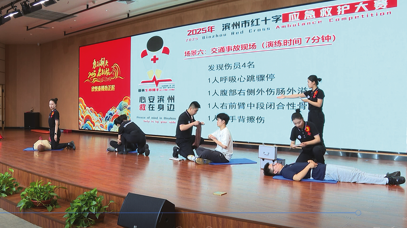 大赛以“心安滨州·救在身边”为主题,旨在检验近年来全市红十字应急救护培训工作成效,进一步推动公众自救互救知识技能普及,努力形成“人人学急救,急救为人人”的良好氛围。大赛分为个人赛和团体赛两部分,比赛内容为心肺复苏、创伤救护、救护演讲、场景演练等。本次大赛首次由市委市直机关工委组织市直32家单位,组成3支队伍和37名个人参加比赛。全市共有11支队伍91名队员参加比赛。经过激烈角逐,评选产生了团体奖8名,心肺复苏、创伤救护单项奖各33名,救护演讲单项奖8名。