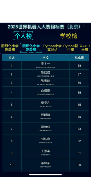 晚报讯 近日,在2025世界机器人大赛北京锦标赛上,滨州经济技术开发区第一中学9岁的李卜一同学,以88分佳绩,在图形化编程小高组(4—6年级组别)的激烈角逐中,力压全国100余所学校的强劲对手,一举摘得全国总冠军桂冠。