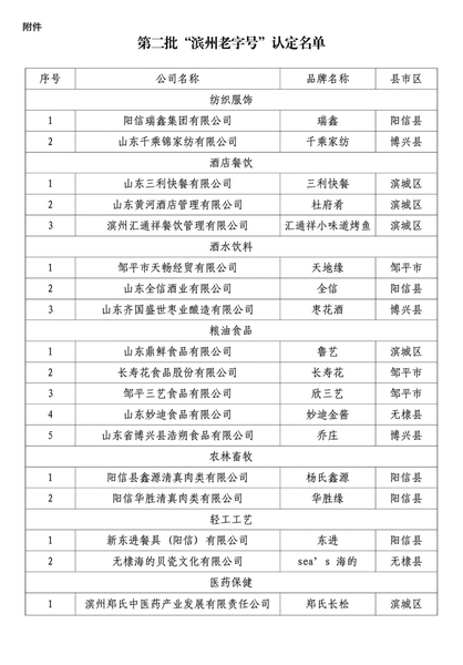 为弘扬滨州优秀传统文化,推动老字号创新发展,培育壮大老字号品牌队伍,近日,滨州市商务局会同市直相关部门、行业协会及专家组成评审组,对各县(市、区)推荐的第二批“滨州老字号”申报企业进行了严格评审。经社会公示无异议后,最终认定阳信瑞鑫集团有限公司(品牌:瑞鑫)等18家企业为第二批“滨州老字号”(名单附右)。