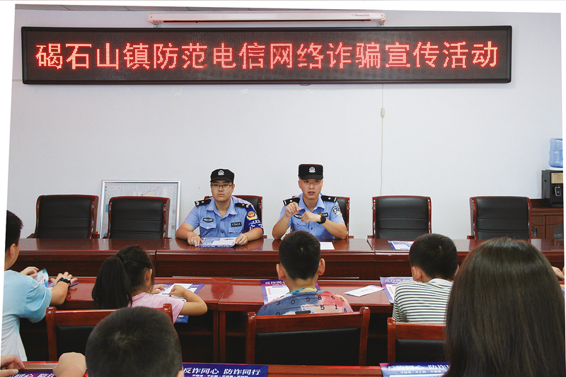晚报无棣讯 8月22日,在无棣县碣石山镇张家码头村文化活动中心,碣石山派出所民警正在为四十余名中小学生讲解防电诈骗知识。