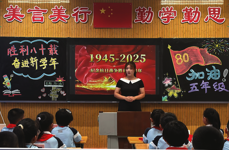 教室门口,纪念抗战胜利80 周年海报诉说历史;课桌上,红领巾与烈士事迹展牌整齐摆放,让孩子感受先烈精神。