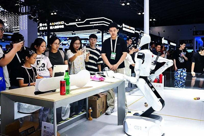 在2025世界人工智能大会展览现场,参观者在观赏一款可用于零售、工业等多种场景的机器人(2025年7月29日摄)。