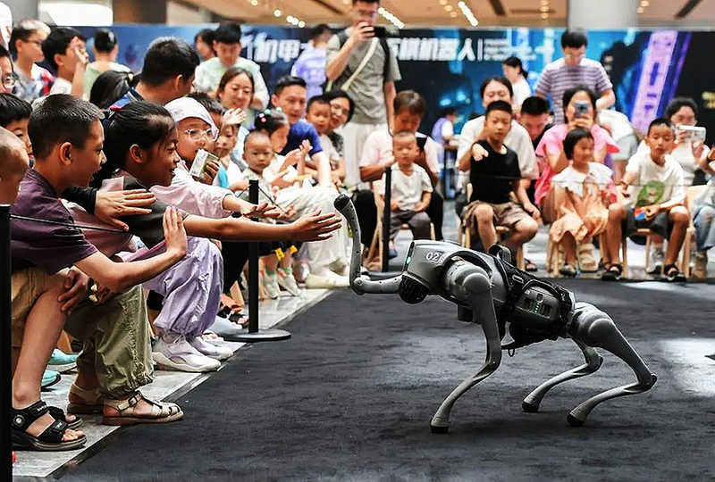 7月6日,浙江省金华市金华之光文化广场科技馆内,小朋友与智能机器狗互动,沉浸式感受人工智能技术的魅力。 近日,在国家发改委召开的新闻发布会上,相关负责人就日前国务院印发的《关于深入实施“人工智能+”行动的意见》相关问题答记者问。