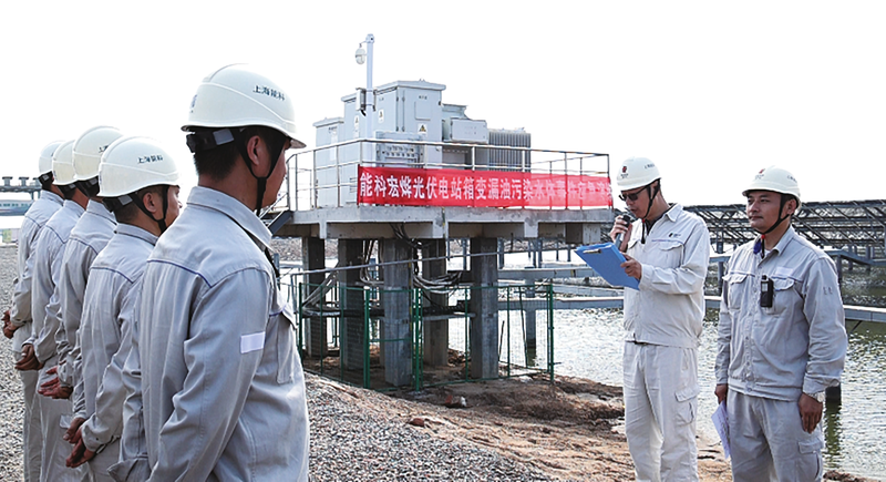 在全球单体最大的渔光互补发电项目现场,沾化区宏烨新能源有限公司工作人员重点讲解了项目规模、渔光互补模式(上层光伏发电、下层水产养殖)的运作原理及其在海域集约利用方面的优势,项目在建设期及运营期全过程中为防治工程污染损害海洋环境所采取的具体措施,以及工程污染海洋环境应急预案体系、应急物资储备、应急队伍建设情况以及日常应急演练开展情况。