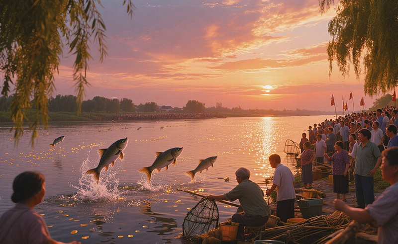 捕鱼节定在夏日的傍晚,落日熔金,晚霞满天,夕阳的余晖洒在宽宽的河面,波光粼粼,如片片碎金点缀河面,美得让人心醉。鱼儿似乎也不甘寂寞,不时跃出水面,打得水面啪啪响,向岸上准备捕鱼的乡亲们挑衅。河边的柳树在晚风中轻摆着枝条,仿佛在向鱼儿招手。老乡们站在岸上,男女老少,齐齐整整,密密麻麻。老人们在传授经验,反复叮嘱如何下网、拉网、收网;青壮年一边细心地听着,一边整理着捕鱼的工具;孩子们静静地等待着,等待着捕鱼节的开始。