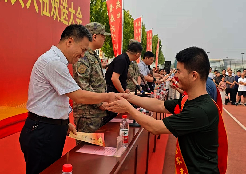 欢送现场,50余名新兵身着戎装、肩披绶带、胸戴红花,人人军容严整,个个英姿飒爽,带着亲人的嘱托和期望,满怀从军报国、建功立业之志,即将奔赴火热军营,踏上强军征程。