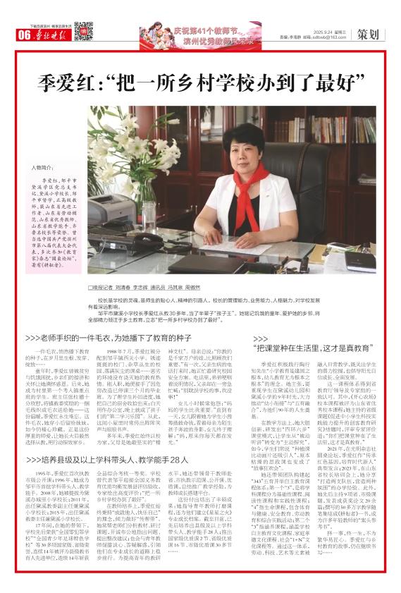 人物简介:季爱红,邹平市黛溪学区党总支书记、黛溪小学校长、邹平市督学,正高级教师,获山东省先进工作者、山东省劳动模范、山东省优秀教师、山东省教学能手、齐鲁名校长等荣誉。曾当选中国共产党滨州市第八届代表大会代表,多次参加《教育家》杂志“圆桌论坛”,著有《耕耘者》。