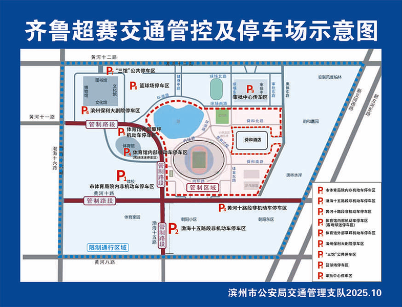 10月1日和8日,滨州市全民健康文化中心体育场将迎来2025年山东省齐鲁足球超级联赛滨州主场两场比赛。第一场为10月1日滨州队VS东营追风少年队,第二场为10月8日滨州队VS德州文增队。比赛期间,体育场周边车流、人流较大,届时,滨州公安交管部门将对滨州市全民健康文化中心体育场周边路段实施交通管制及引导。