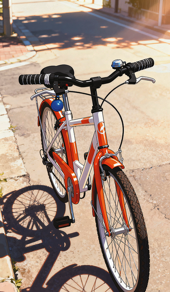 楼下的车棚里,停着一辆橙白相间的自行车,它车身锃亮,黑色的车把上缠着防滑胶带,车轮上的花纹清晰有力,车座旁还挂着我亲手系的蓝色铃铛——这是爸爸在我十岁生日时送我的礼物,我给它取名“闪电”。