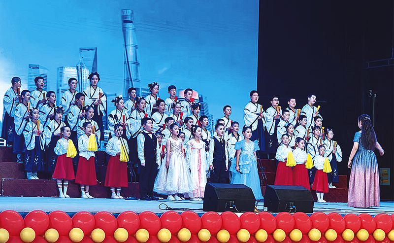 舞台上,孩子们身着汉服,衣袂翩跹间尽显国风韵味,与背景屏上的壮丽山河交相辉映。传统服饰的典雅庄重与少年们蓬勃的朝气相映成趣,既展现出中华文化的深厚底蕴,又彰显了新时代少年的精神风貌。随着旋律响起,“红日升在东方其大道满霞光”的清澈童声缓缓流淌,时而婉转悠扬,如清泉浸润心田;时而铿锵有力,似战鼓催人奋进。指挥同学动作标准有力,合唱队员目光坚定、配合默契,将歌曲中“我何其幸生于你怀”的自豪感与“山河无恙祖国万疆”的赤子情演绎得淋漓尽致。台下师生深受感染,报以热烈的掌声。