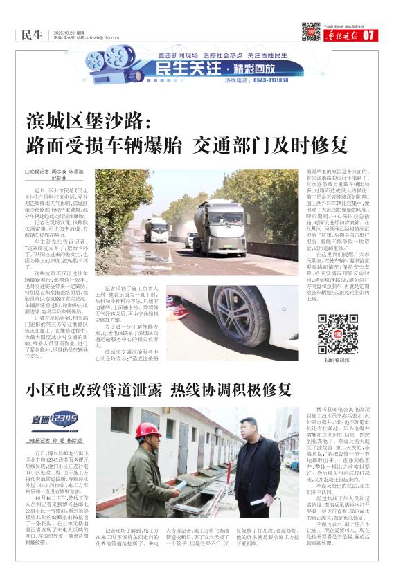 滨城区堡沙路:路面受损车辆爆胎 交通部门及时修复