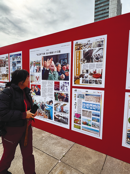 10月18日,观众在参观“和平发展 逐梦同行——全国主流媒体新闻摄影展”,欣赏《滨州日报》的影像版面。