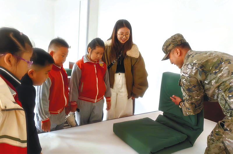 在武警宿舍,棱角分明的“豆腐块”被子、摆放有序的生活用品,让同学们惊叹不已。武警战士现场演示了叠军被的全过程,从铺平被单、压实边角到捏出棱角,每一个步骤都讲解细致、操作规范。看到同学们跃跃欲试,战士们手把手地进行了指导,大家也都学得格外认真,虽然成品略显稚嫩,但认真严谨的作风已吹进内心深处。“原来叠被子也有这么多学问,以后我也要自己整理房间,养成好习惯。”体验结束后,一名同学坚定地说。