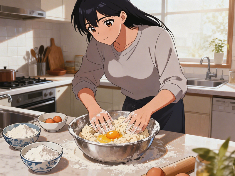 我进厨房,将手洗净,舀两碗面粉在盆里,敲两颗鸡蛋置于面上,顺势将面与蛋搅成面絮。接着左手把着盆边儿,右手手指协作打着圈儿,手掌顺着圈儿将面絮儿揉压成团。直至它硬韧,似光溜溜的缎子,又如一张平闪闪的镜子,再用保鲜膜裹起来醒发。