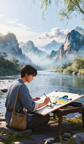 就这样,夹着清晨清风,我左臂悬画袋,右手揽桌板,一路到河边,寻得一处清冷之地,席地而坐,觅得一处心仪之景,手指弯曲,执一小毫,提笔按压,不施加焦墨,只是稍着淡墨,描绘出群山的轮廓,勾勒出天边云脚。又加以清水,笔肚稍着花青、藤黄,皴擦点染,在群山间毫无拘束地渲染,空明澄澈,疏影摇曳,似真似幻,勾勒一笔柔情。