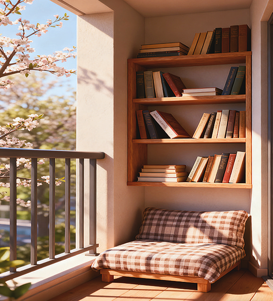 我的阳台可不只是能看风景。在阳台的隐秘角落,藏着我的“迷你图书角”。那里面摆满了我热爱的书籍,每当春天来临,我便沐浴在暖暖的阳光下,沉浸在书的海洋中。