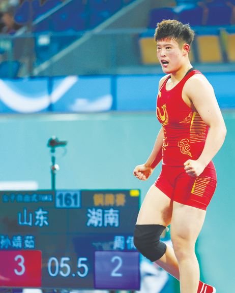 晚报讯 11月11日,第十五届全国运动会摔跤女子自由式76公斤级比赛在广东清远举行。来自山东滨州的选手孙靖茹在铜牌争夺战中顶住压力、奋勇拼搏,最终力克对手斩获铜牌,为山东代表团再添一枚宝贵奖牌,也为家乡滨州赢得了荣誉。