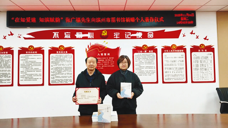 晚报讯 近日,市民张广福先生向滨州市图书馆捐赠个人著作《人生情理》8册。市图书馆接收捐赠,并向其颁发捐赠证书。