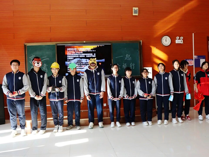 “Hello,welcome toNortheast China!”第四组同学以全程英文讲解开启了东北之旅。当熟悉的动画角色“熊大”、“熊二”和“光头强”惊喜现身教室前排,一场关于森林保护的主题短剧让全场忍俊不禁。随后,几位同学手执彩绸,一段热情奔放的东北秧歌瞬间点燃气氛,将教室变为活力四射的东北舞台。从冰天雪地的自然奇观到豪爽热烈的民风民俗,从黑土地的丰饶物产到老工业基地的振兴叙事,地理知识、文化传承与语言应用在这场展示中实现了有机融合。