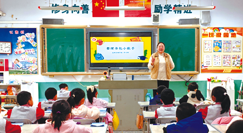 活动中,老师以“帮图图整理书包”创设情境,播放动画片段引导学生发现杂乱问题,分享收纳妙招;通过贴画教学讲解分类标识,指导按用途、科目归类文具。此外,学生放学后与家长实操练习,在亲子互动中巩固技能。