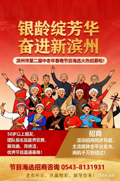 当岁月沉淀成智慧,当热爱碰撞出火花,一场专属于滨州市中老年人的文化盛宴即将启幕!为丰富中老年群体精神文化生活,助力“品质滨州”建设,滨州市新闻传媒中心(集团)重磅推出第二届中老年春晚节目海选活动,现面向全市火热招募参赛队伍,并同步开启招商合作通道,诚邀社会各界携手共赴这场文化之约。