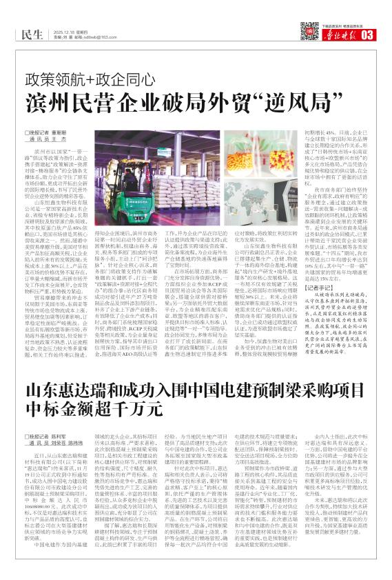 山东惠达瑞和成功入围中国电建预制梁采购项目 中标金额超千万元