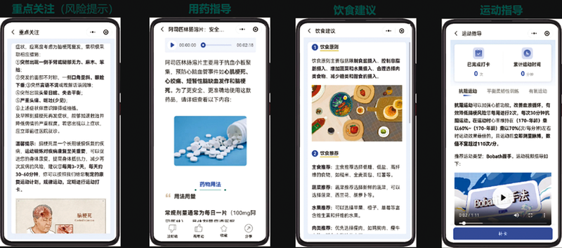 平台结合规范的疾病管理路径,由专业人员(医生、护士、健康管理师)组成的疾病管理团队,为患者制定个性化的康复计划,包含患者建档、专病随访、患者咨询、重点关注事项管理、护理提示、复查提醒、用药指导、饮食建议、运动指导、病情评估、结果跟进、风险预警管理、健康宣教等,在院外开展患者疾病管理,打造院外“随身医生”,显著提高患者疾病管理的依从性、健康知识的知晓率和及时复诊率,以最短时间、最佳质量、最少耗费,达到最优效果。实现患者“出院不离管理、离院不离服务”的目标,让优质医疗资源惠及更多群众。