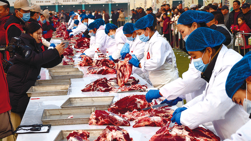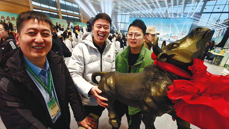 赛场内,16地市大厨同台“烹牛”PK,锅铲翻飞、炉火升腾,金黄火环转瞬即逝,各色牛肉佳肴香气弥漫,引得现场阵阵惊叹。赛场外更热闹,六口大锅熬煮的牛肉汤热气腾腾,食客排起长队等着免费品鉴;200多个展位上,牛肉制品、非遗文创、特色农产品琳琅满目,大人带着孩子吹糖牛,挑选手工艺品,逛集采购年味十足。