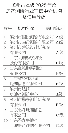 滨州市2025年度房产 测绘行业守信中介服务 机构(市本级)名单公布