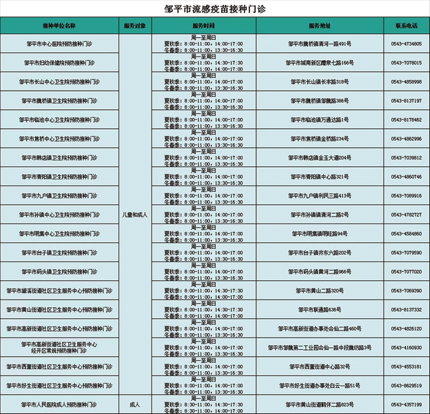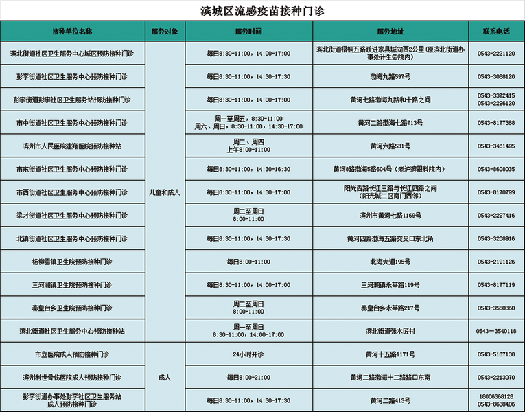 为满足广大市民接种需求,滨州市所有预防接种门诊周末均可提供流感疫苗接种服务。有接种需求的市民,可携带预防接种证、身份证等有效证件,到就近的预防接种门诊接种。
