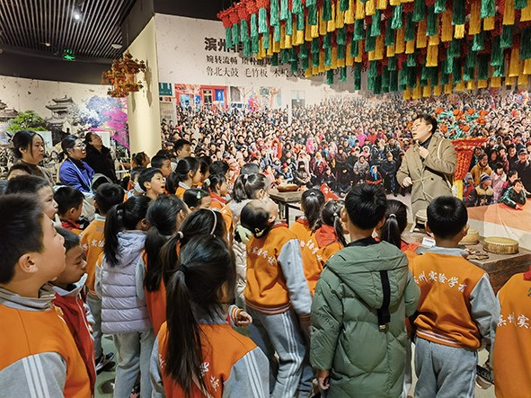 在文化馆,学生们重点参观了馆内的非遗展区。他们仔细倾听讲解员介绍滨州各类非遗文化,从发源于博兴的吕剧与草柳编,到惠民的胡集书会、泥塑、木版年画,再到滨州民间剪纸、邹平芯子、沾化渔鼓戏,每一项非遗技艺都让孩子们听得兴致盎然。