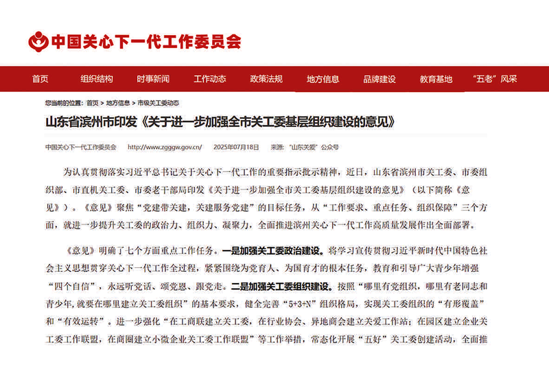 关心下一代事业,是关系党的事业薪火相传、民族复兴的战略工程。2025年,滨州市各级党委政府将关工委工作摆在重要位置,持续加大支持保障力度。
