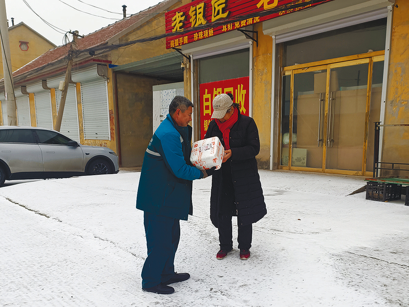 乡村路段的投递面临更多考验,道路被积雪全覆盖,结冰路面湿滑难行,投递三轮车数次打滑。投递员们便一手扶车把、一手撑地面,一点点艰难向前挪动;遇到实在无法骑行的路段,他们干脆肩挑手提,挨家挨户完成投递。“路再难走,也不能落下一个投递点、耽误一个邮件。”有着十年投递经验的老员工丁张杰搓着冻得僵硬的双手说道,他的睫毛凝着霜花,脸颊已冻得发紫。