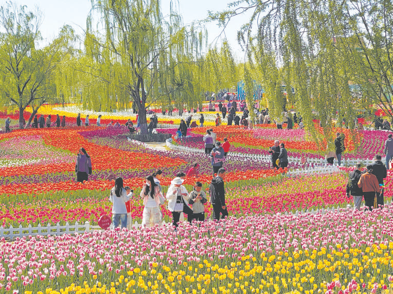 4月4日,清明假期首日,记者走进滨州经济开发区秦皇河公园,数百万株郁金香竞相绽放,在春风中摇曳生姿,与波光粼粼的河水、嫩绿的柳枝相映成趣。公园内游人如织,摩肩接踵,或驻足拍照,或漫步花间,孩子们在空地上嬉笑奔跑,欢笑声此起彼伏。“趁着假期带家人来看郁金香,没想到人这么多,但景色确实太美了,不虚此行!”带着孩子游玩的市民杨天箫一边用手机记录美景,一边感慨。