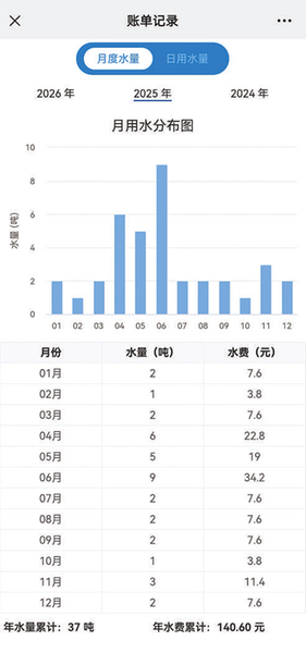 16日,记者查看了付先生的用水信息。在该供水公司掌上营业厅的“水账单记录”中可以看到,2026年前三个月的用水分布图显示,每月用水量均为整数。记者进一步查阅付先生2025年、2024年的用水记录,每月用水量全部为整数,平台水量计量单位为“吨”。